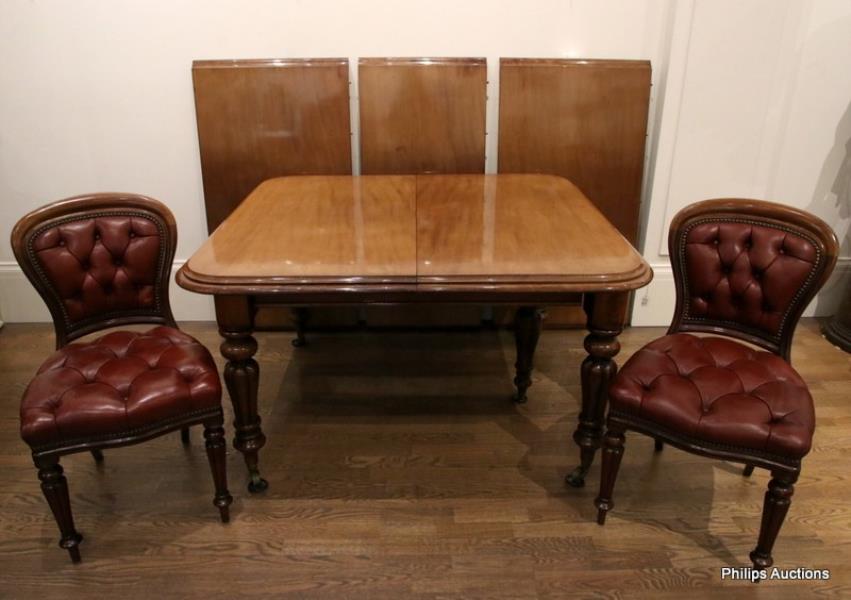 The draw leaf rectangular extension table with thumb nail and bull nose moulded edge and plain skirt on four fluted baluster legs and brass cup castors, with three extension leaves, with a set of ten Victorian mahogany balloon back dining chairs covered in close-nailed burgundy leather button back above a conforming stuffover seat, and raised on turned and reeded tapering front legs.