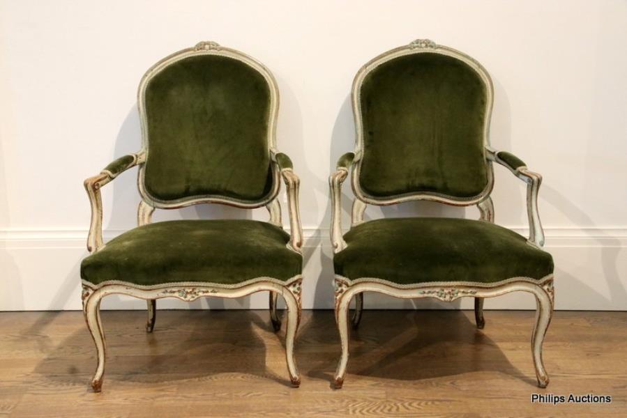 The Louis XV white-painted and beech-framed open armchairs, channel-moulded throughout, each with a floral carved crest and cartouche upholstered back issuing volute scrolled arms with shaped supports, to a serpentine seat with conforming seat rail, raised on cabriole legs with carved knees, upholstered in green velvet.