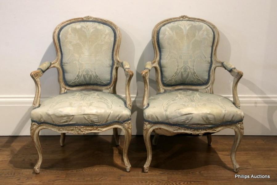 The pair of Louis XV style open armchairs with traditional mortise, tenon and pegged construction, painted white frames, each foliate carved crest, the cartouche back upholstered and issuing volute scrolled arms with shaped supports, the upholstered serpentine seat above a conforming seat rail, raised on cabriole legs with carved knees and feet, upholstered in patterned blue silk taffeta, a/f.