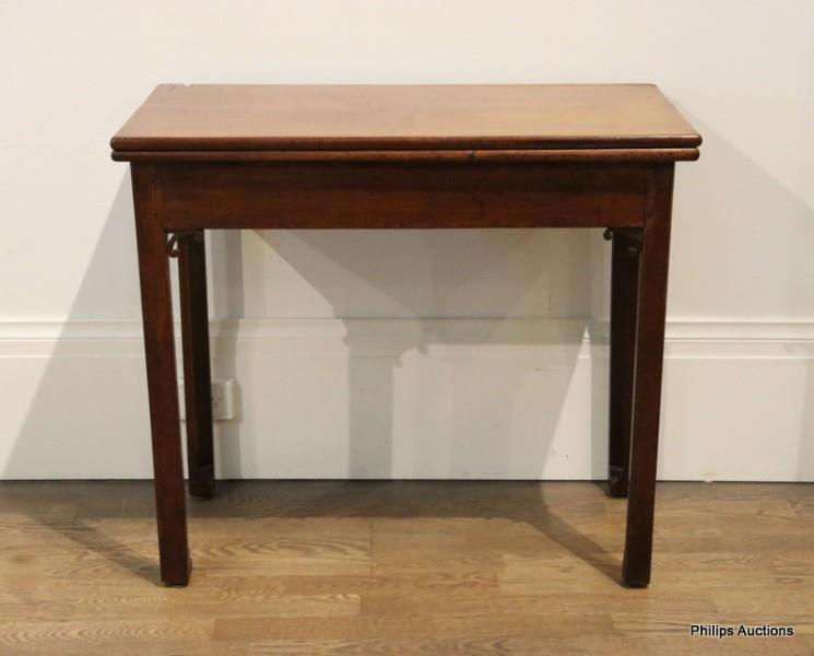 This complete card table had the gateleg glued and nailed at some point. Until restored, this now a hall table, the top does open to a replaced green velvet lined surface, with a plain skirt and scroll detailing to the corners, raised upon four square legs with chamfered edge.