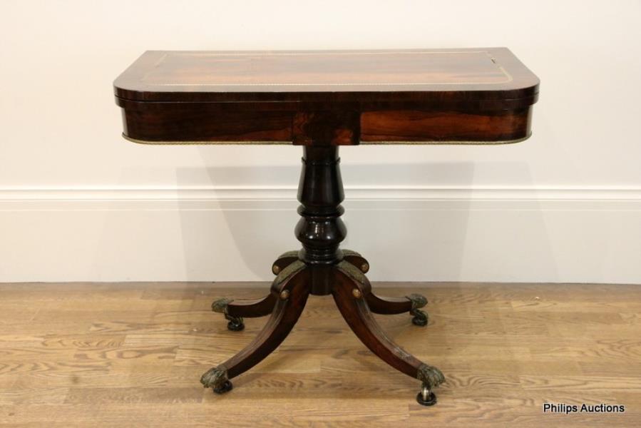 A REGENCY ROSEWOOD FOLD-OVER CARD TABLE WITH BRASS INLAY
