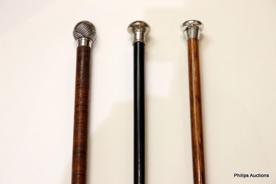 Comprising a partridge wood walking stick with silver pommel (1924 London, maker's mark B&TI), a fiddleback blackwood walking stick with a fluted 'wool ball' globe top (1933 London, Thomas William Daniels) the collar engraved S Armstrong Stokell Malvern, and another with an ebonised wood shaft and nickel plated pommel.