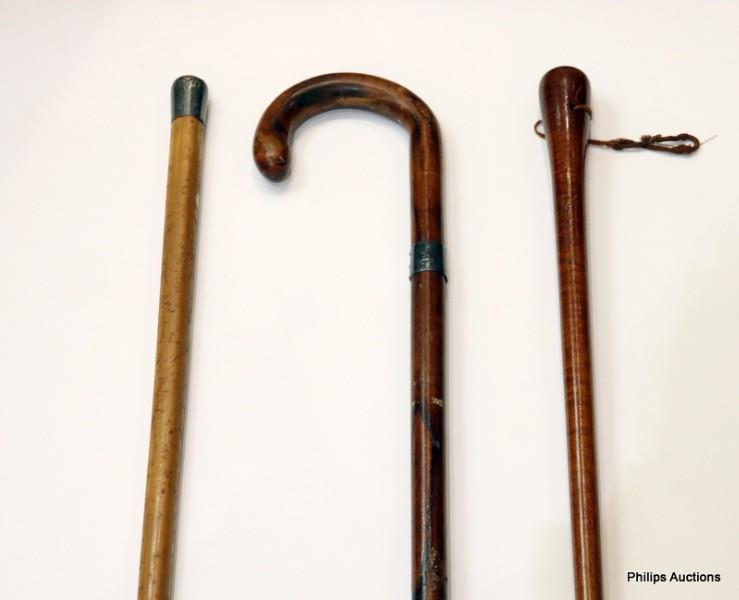 Comprising one with a plain cylindrical knop (English silver mark rubbed), probably Malacca wood, a walking cane with silver collar marked 'Sterling Silver, maker C&Ss', and another with a fiddleback shaft.