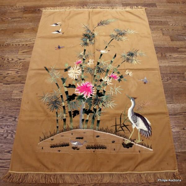 The large embroidery depicting a crane and smaller birds in flight, with bamboo, floral sprays and a butterfly.