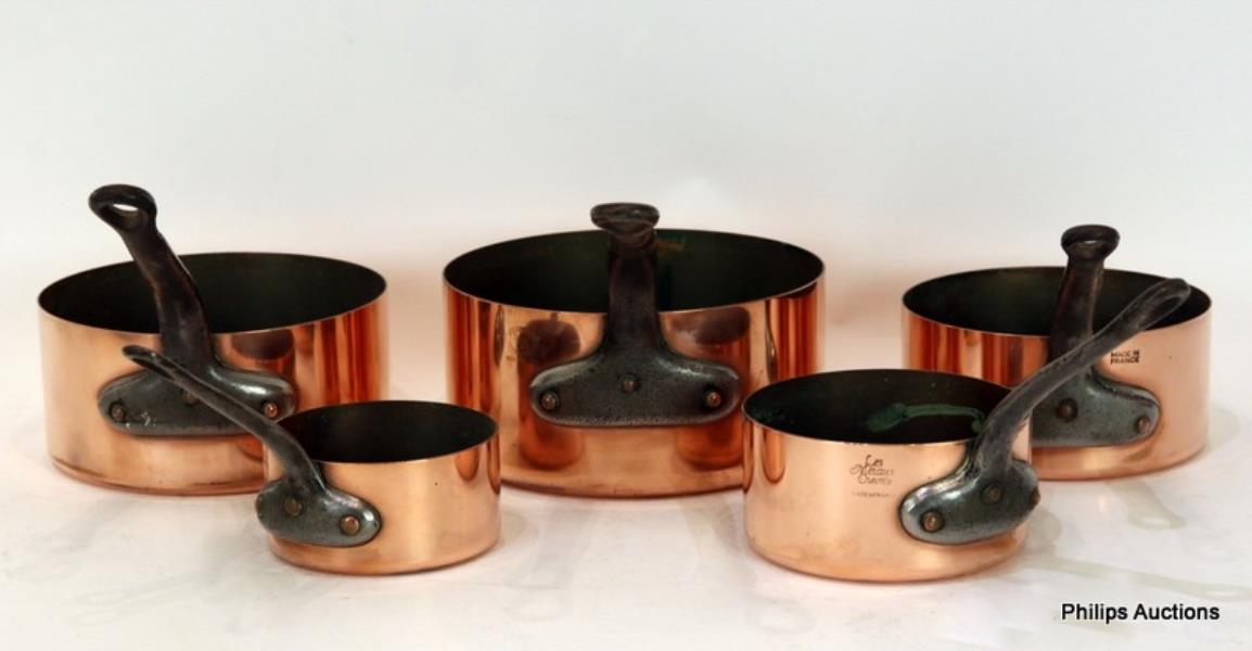 The graduated set of five heavy gauge straight sided saucepans, with rivet joined steel handles, stamped 'Les Cuivres de Faucogney Made in France'.