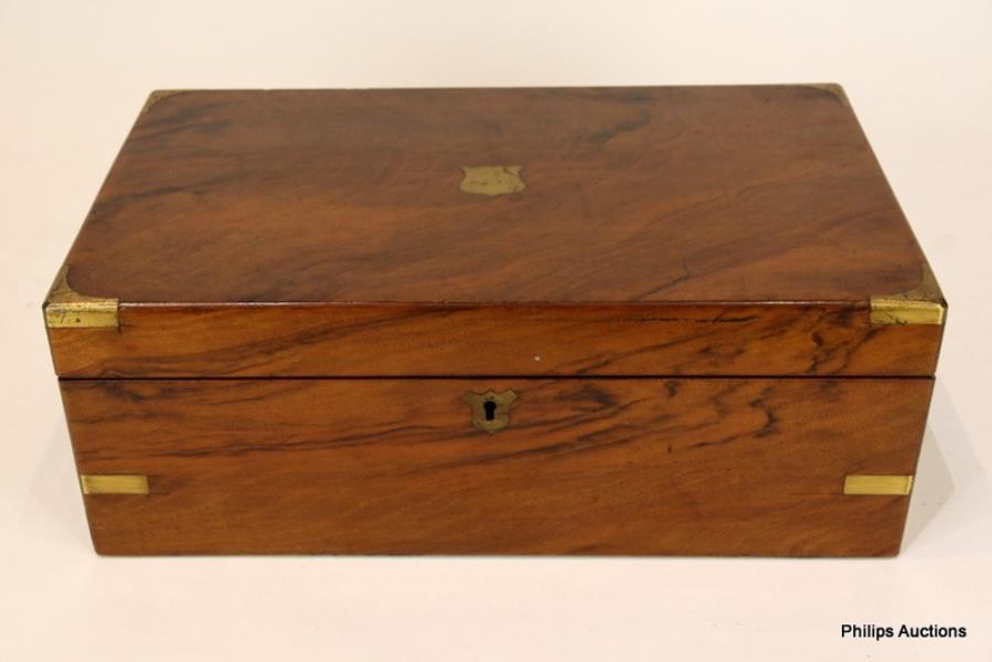 The brass trimmed slope with brass shield form cartouche, opening to a tooled and gilded black leather slope and compartments for ink bottles and writing implements.