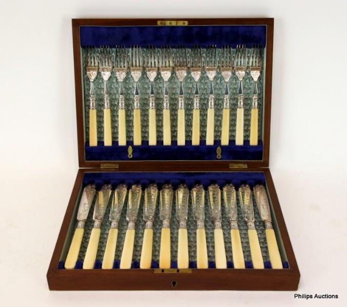 Comprising 12 forks and 12 fish knives, the knife blades and fork throats bright cut and prick worked with foliage and scrolls, with sterling silver ferrules and plain round end ivorine handles, housed in their original fitted timber case, with plate marks to the blades and hallmarks to the ferrules.