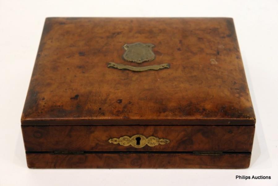 The rectangular box with an engraved brass shield form cartouche and escutcheon, opening to a tooled and gilded blue leather slope, with compartments for letters and ink bottles and writing implements, with a bone handled dip pen and inkwell. Height: 8cm Width: 24.5cm Depth: 20.5cm