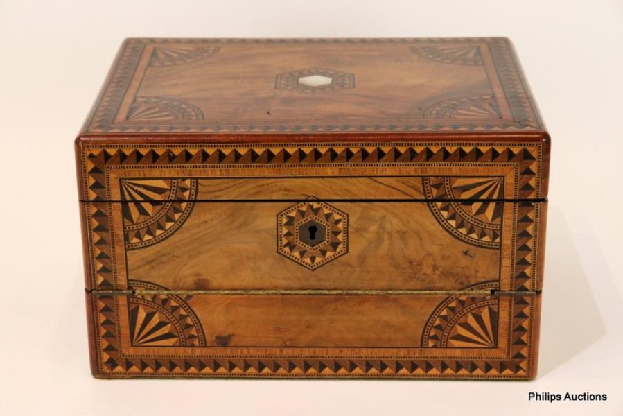 The fine rectangular ladies writing box opening to a tooled and gilded green leather writing surface with compartments and pen tray, the body geometric inlaid with mahogany, rosewood, boxwood and ebony, and with a hexagonal mother-of-pearl medallion to the top.