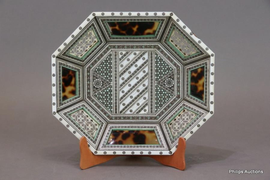 The elongated octagonal dish raised on four ivory ball feet decorated to the well with an intricate geometric mosaic of bone, green stone and ebony surrounded by a superb border of alternating openwork carved bone fretwork reserves and faux tortoiseshell panels.
