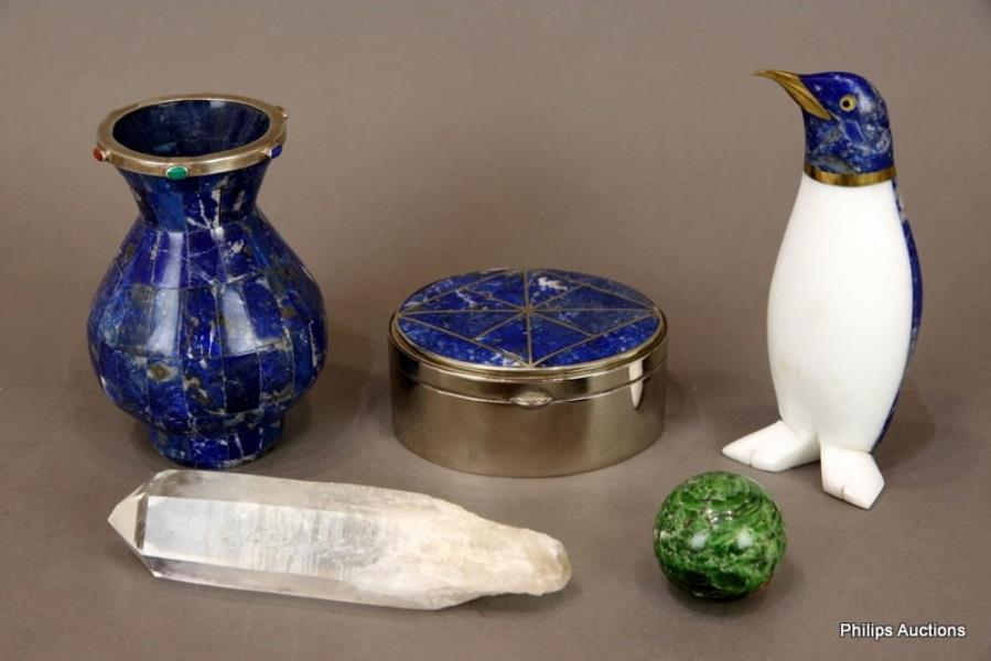 Comprising a lapis lazuli and white marble carved penguin with a brass beak and collar, a lapis lazuli-tiled vase with a silver rim inset with cabochon semi-precious stones, an oval trinket box in white metal with a lapis lazuli inset top and geometric design, a nephrite ball and a quartz crystal point.