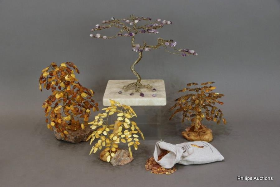 Comprising one with brass wire trunk and leaves of multi-coloured amber upon a stone base, another larger with amethyst leaves upon a square marble base, and smaller amber examples, together with a small bag of amber from Mizgiris Amber Museum (Lithuania).