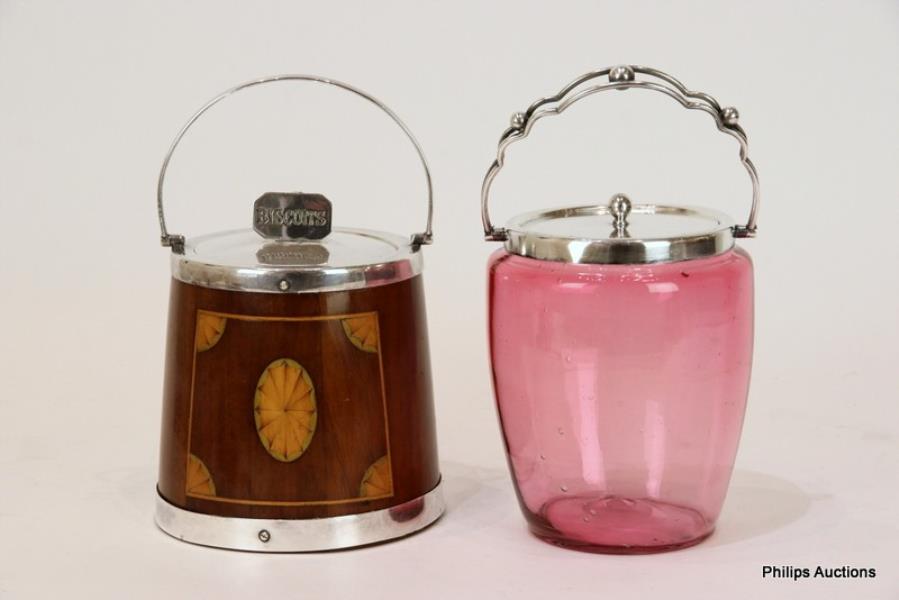 The late Victorian biscuit barrels in inlaid mahogany and cranberry glass, with silverplate mounts, covers and swing handles.