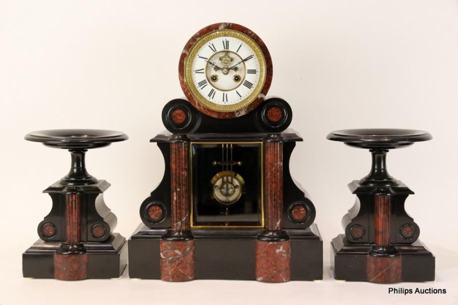 With a drum head housing an enamelled Roman numeral dial with exposed brocot escapement set within a gilt bezel, above a central glazed panel showing an Ellicott-type pendulum and flanked by reeded pilasters in contrasting rosso antico marble and volutes upon a plinth base, the pair of architectural form tazze conforming, the bell striking movement stamped 'F. Marti Médaille de Bronze', with key. Height: 46cm Width: 35cm Depth: 16.5cm (clock)