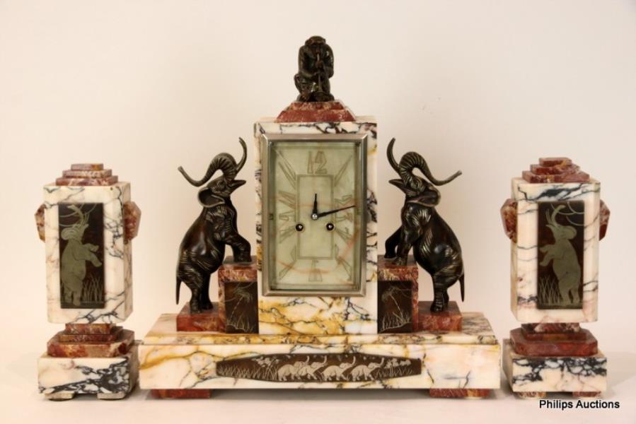 Lardot et Boyon (movement), circa 1925. The fine mantel clock with a stepped two-tone mottled red onyx & veined cream marble case enclosing a faux green onyx dial with Arabic numerals flanked by a pair of patinated bronze trumpeting elephants & surmounted by a seated monkey musician, on marble plinth, with matching garniture pieces of stepped & canted upright form, decorated with silvered bronze panels of elephants & foliate designs, the twin train bell-striking movement stamped 'Lardot et Boyon Paris', pendulum & key. H: 47cm W: 46.5cm D: 13.5cm (clock)