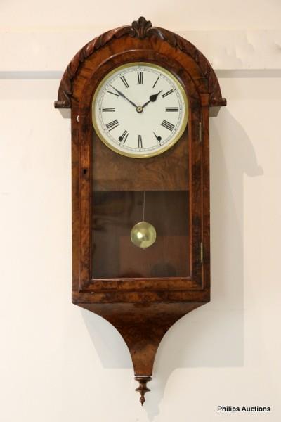 In well-figured burr walnut with a foliate carved arched case housing a Roman numerals dial, with brass pendulum and key, as Found.