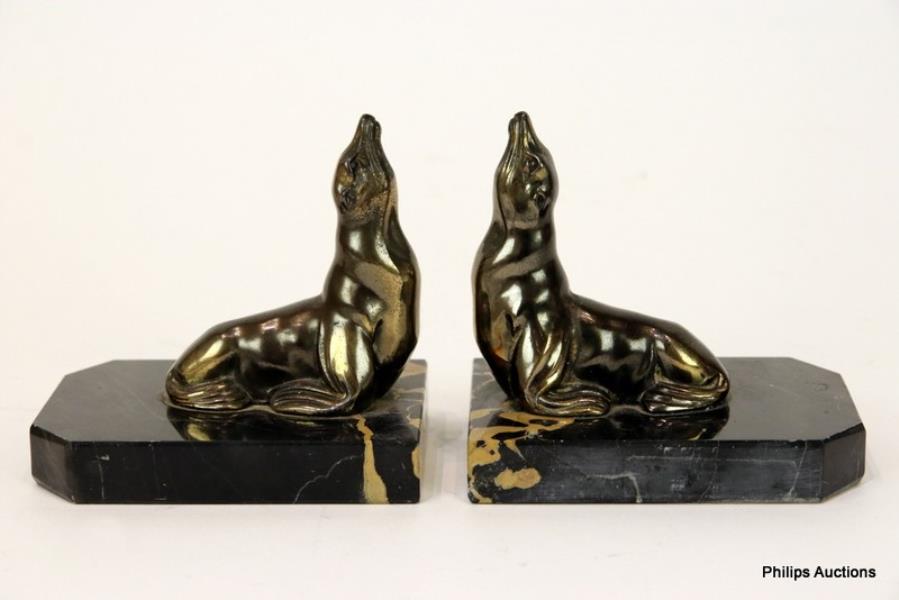 The pair of stylised seals in gold lustre tone, upon portoro marble bases