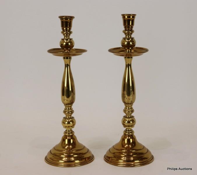 The polished brass candlesticks, each with an urn-shaped nozzle and disc drip pan on an elongated baluster knopped shaft to a tiered conical base.