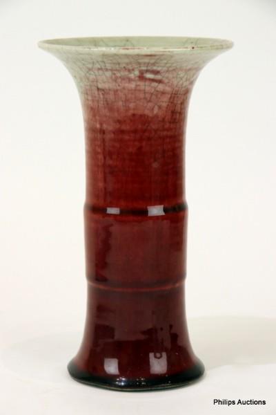 Covered in a crackled glaze of intense raspberry-red thinning gently from the knopped mid-section to a pale celadon mushroom tone towards the mouth, the underside of pale grey tone with crackles, with Sotheby's labels underside. Ex. Sotheby's Melbourne circa 2004, Lot 533.