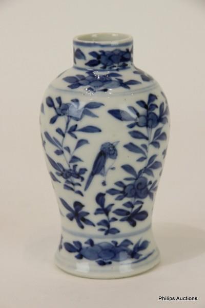 The baluster form small vase decorated with birds amongst prunus flower sprays, with Kangxi four-character mark to the underside. Height: 13cm