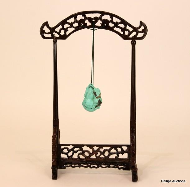 A CARVED TURQUOISE HANGING ORNAMENT ON STAND
