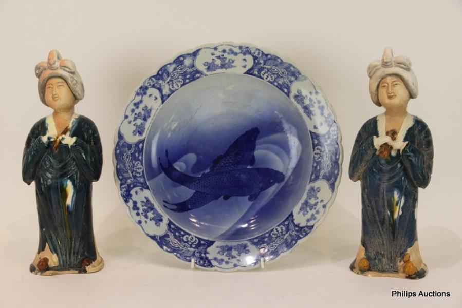 A PAIR OF TANG-STYLE POTTERY FIGURES AND A BLUE AN WHITE CARP CHARGER