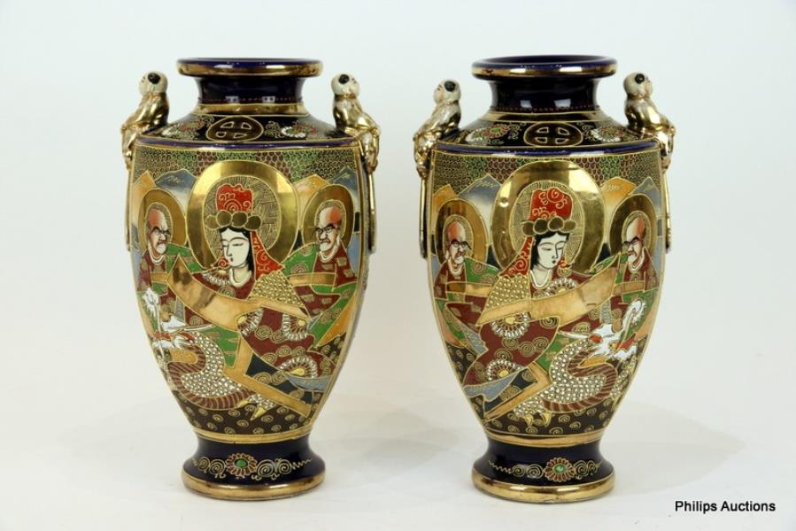 The baluster shaped vases with figural twin handles, featuring the deity Kannon with a gilt halo, adorned with flowers and flanked by attendants, in dark palette moriage enamels with gilt detailing against a cobalt blue ground.