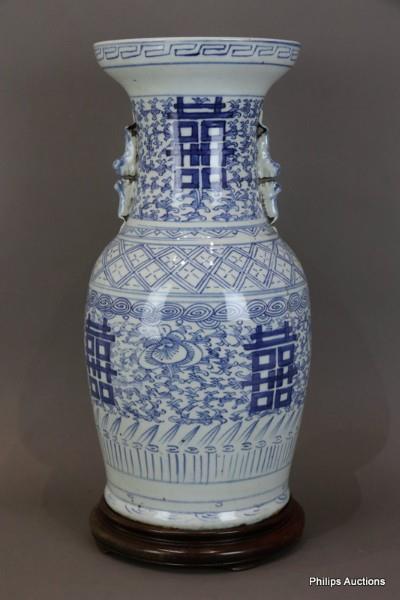 The porcelain vase of baluster form with everted rim and applied lion handles, decorated with double happiness symbols amongst scrolling flowering pea, upon a carved wooden stand.