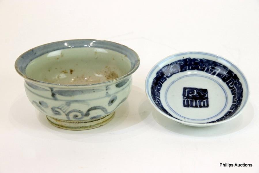 The bowl with en everted rim decorated with underglaze blue scrolls, the small dish with a fretwork border and sprigs to the exterior, each in its silk lined fitted box.