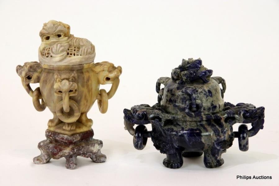 TWO CARVED CENSERS IN LAPIS-LAZULI AND SOAPSTONE