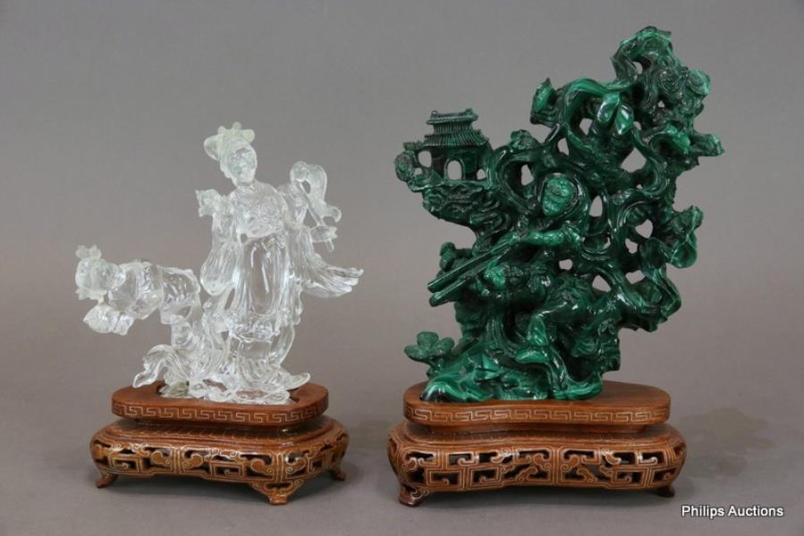 Comprising a clear rock crystal carving of a court lady in flowing robes with attendant on a carved wooden fitted stand with wire inlay, together with a large malachite openwork carving of children fighting amongst foliage by a pagoda on a similar wooden fitted stand with wire inlay.