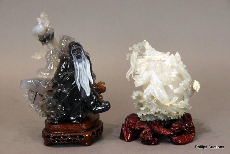 Comprising a superbly carved agate boulder of Xianglong Luohan taming the dragon over turbulent sea, holding in his hands the spiritual pearls and the holy bowl, the translucent stone of milky tone with opaque creamy areas, on a carved wooden stand; together a banded agate group of an immortal with child and dragon also on a fitted wooden stand.