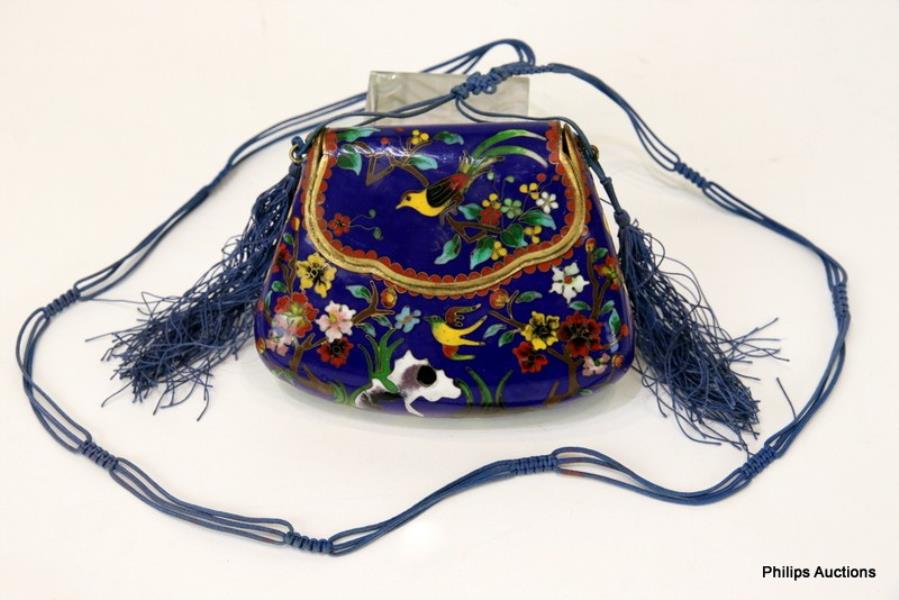 The handbag form cloisonné purse with hinged clap, polychrome decorated with birds on branches and in flight upon a blue ground, with chord attachment.