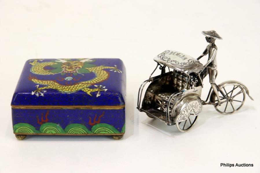 Comprising a Chinese cloisonné box, rectangular on ball feet with a hinged cover decorated with a five-clawed dragon upon a blue ground of tight clouds, together with a Yogya .800 silver rickshaw stamped '800 S. Kardjo'. Weight: 62g