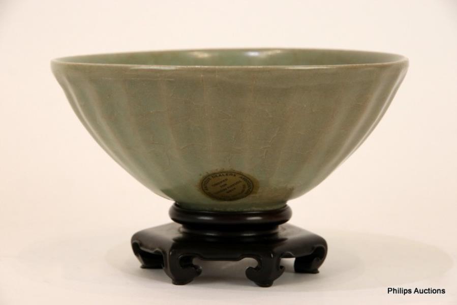 Carved to the exterior with lotus petals rising from the foot, covered overall with a thick crackled glaze of olive tone, fitted on a carved hardwood hexagonal stand with six ruyi-form feet, bearing labels for the Radcliffe Collection no. A28, Bluett and Sons London, BADA and Cape Town 1953 National Gallery. Ex. Gibson's, October 14, 2023, Lot 282: 'Graham Geddes: the Grand Tour Auction', Sold $8,000.