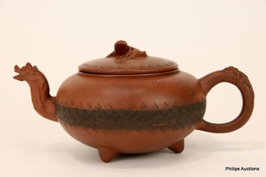 The compressed body incised with a band of classical scroll and ruyi heads, the spout modelled as a dragon head, with a chilong applied to the handle and to the cover, raised on short tripod conical feet, marked under the cover and to the underside.
