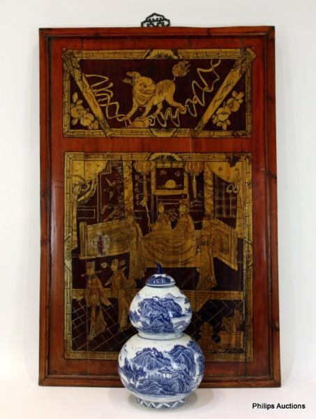 The rectangular elm panel gilt decorated with two reserves including a figural court scene, the top fitted with a paktong ruyi form suspension hook, together with a blue and white porcelain double gourd vase and cover underglaze blue decorated with continuous lakeside and mountainous landscape with fishermen on boats.