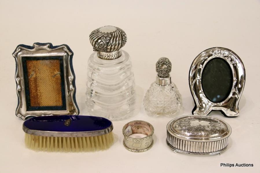 Comprising a large Victorian silver mounted glass scent bottle (1890 Birmingham, John Grinsell & Sons) with a waves cut square tapering body to a hinged turban lid decorated with flutes and floral sprays, marked to the collar, a small diamond cut glass perfume bottle - as found with a later stopper and mark rubbed; together with two silver plated photo frames, a Stokes napkin ring, an engraved oval trinket box and a clothes brush.