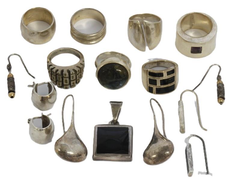 Collection of silver jewellery containing 7 gents style rings, one pendant and 4 pairs of earrings.