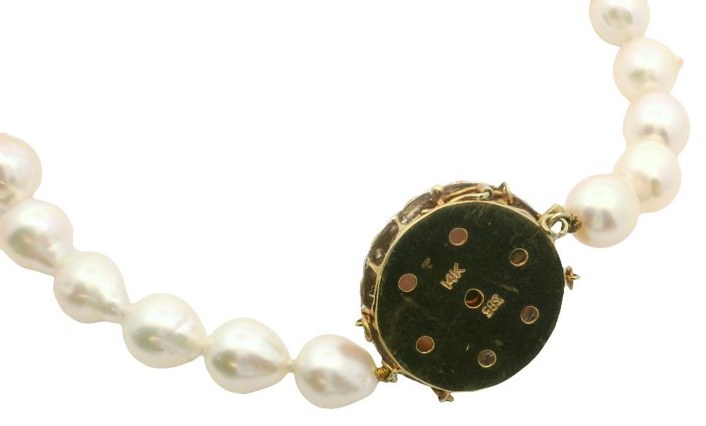 Baroque strand of cream pearls with fine lustre. Each pearl approximately 7mm and is secured with a lovely Mabe pearl clasp in 14ct yellow gold. The clasp has a fine outer edge swirl design with small diamond detail and is secured with both a tongue and figure 8 clip. Approximately 84cm in length and Total weight of 67.7 gram