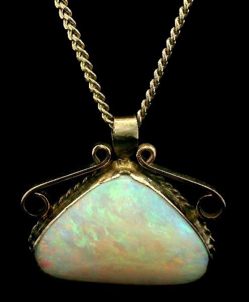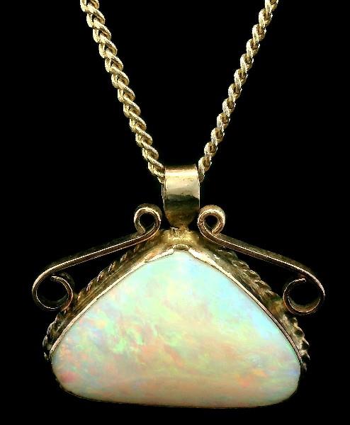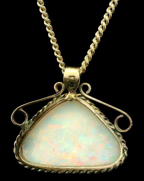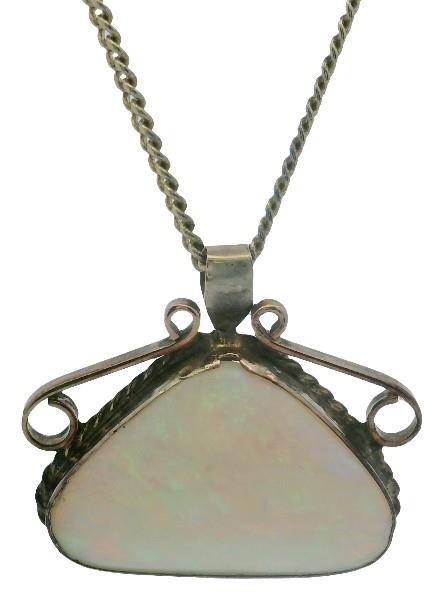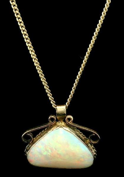 Solid triangular white opal set in 9ct gold pendant with side scroll design and twisted rope edge. The back of the bail is stamped 9ct, and the pendant is suspended from a dress chain.