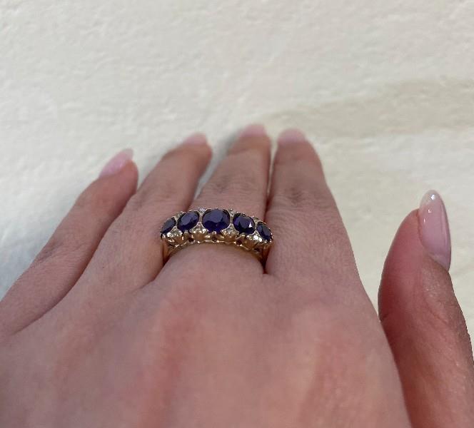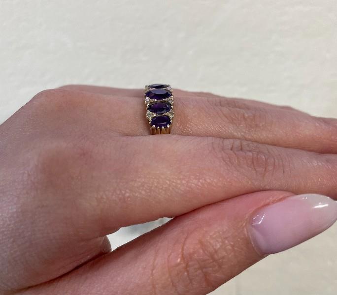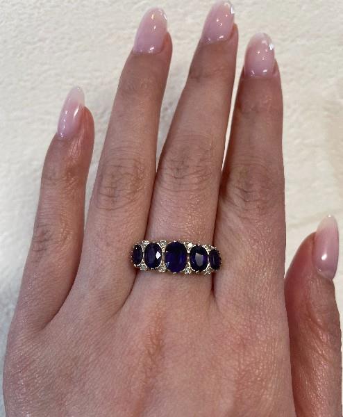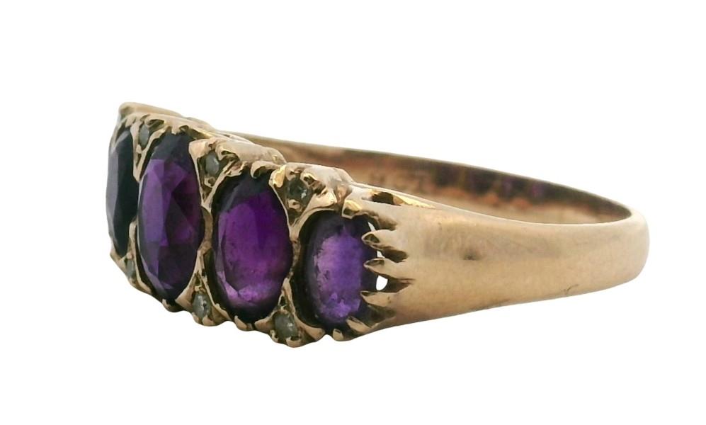 9ct yellow gold, stamped 9k, presented as a large five stone half hoop dress ring of classic Victorian style, each intense oval cut amethyst of strong colour graduating in size with tiny diamonds spacing, scalloped to gallery, merging to a smooth band. Ring Size O1/2. N.B. one amethyst chipped