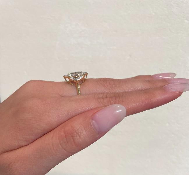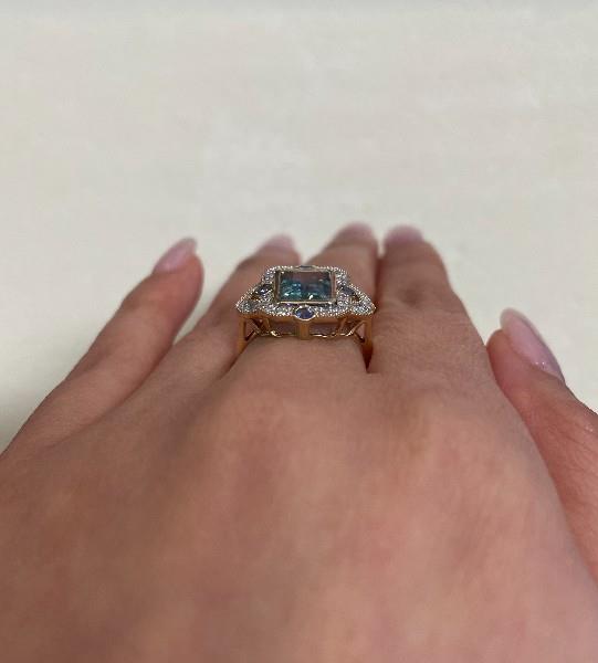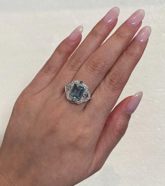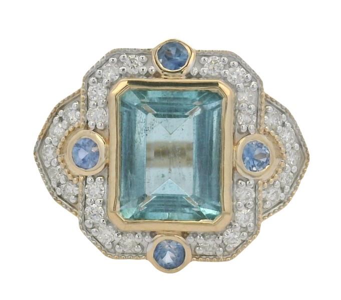 A 14K Y.G ART DECO INSPIRED AQUAMARINE OF 2.29CT, SAPPHIRES (.20CT) & DIAMOND (.25CT) DETAILED RING