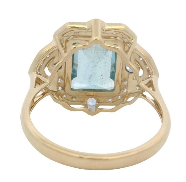 14ct yellow gold, featuring an emerald cut Aquamarine of 2.29ct, medium blue, bezel set, decorated at the cross sections by four round cut Sapphires, totalling 0.20ct, medium blue, bezel set, further decorated by round brilliant cut Diamonds to the frame and sides, totalling twenty-six with a combined weight of 0.25ct. Ring size: N. Valuation on request. Total Weight: 3.6g