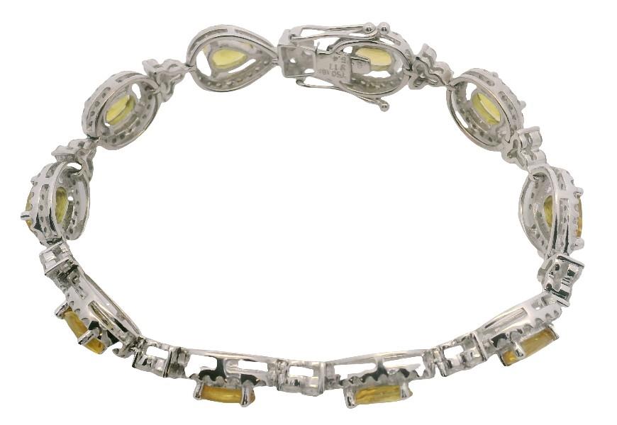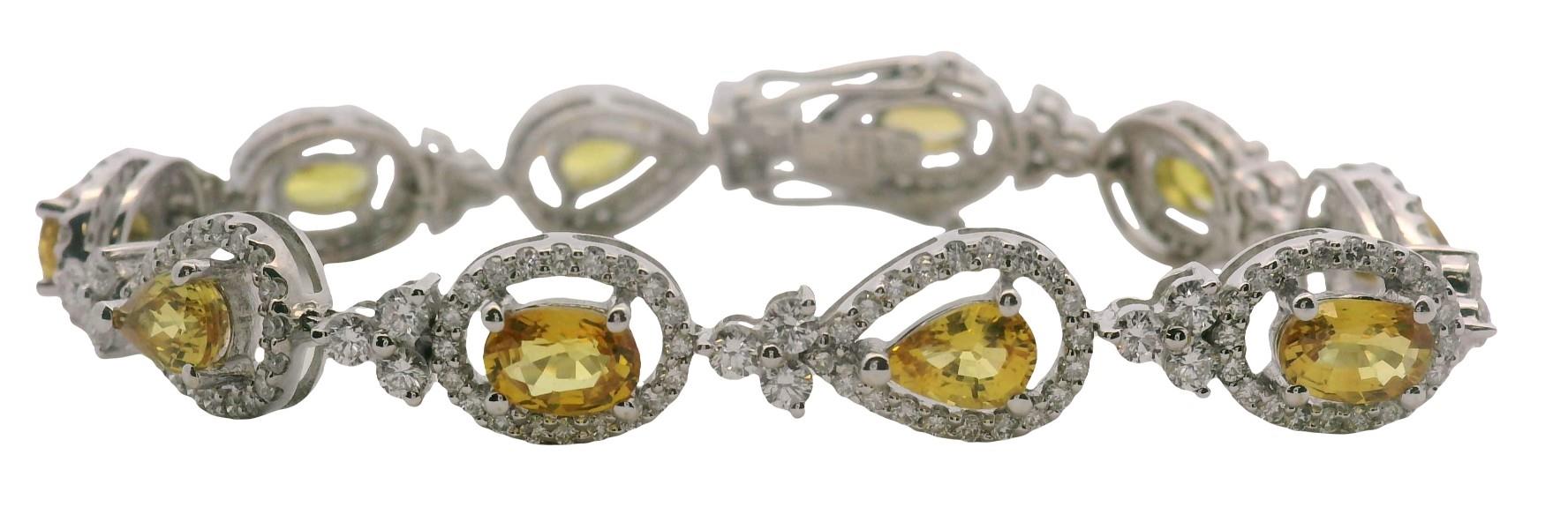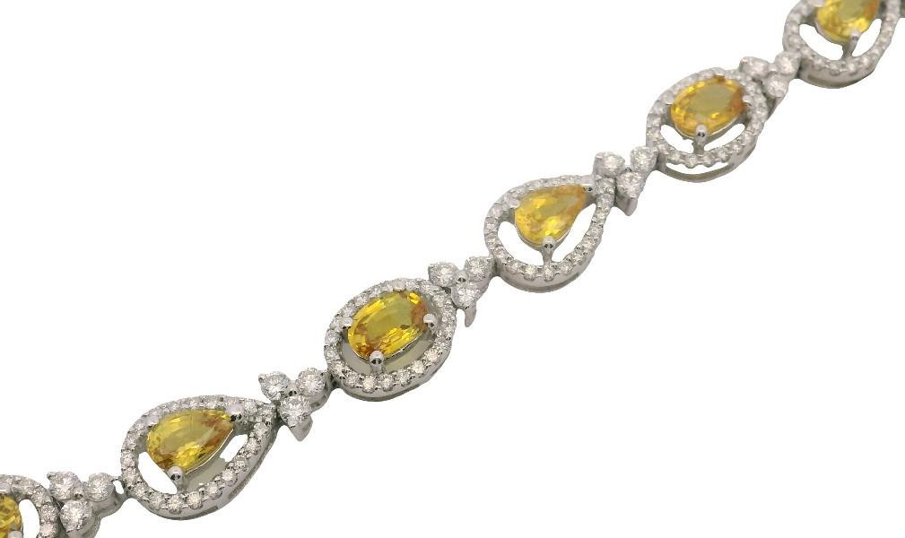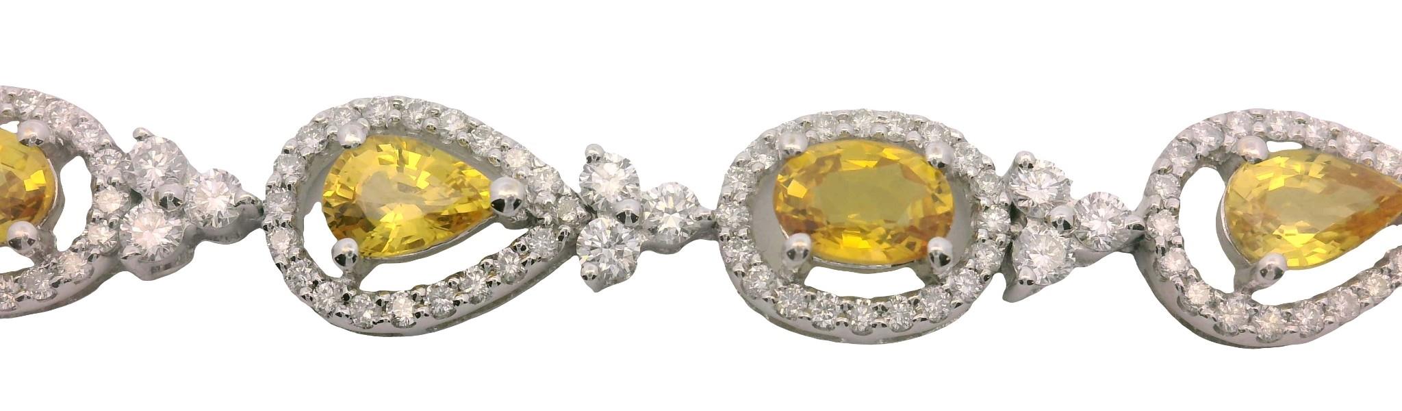 18ct white gold, crafted as a series of alternating pear and oval cut golden yellow sapphires, each weighing approximately 0.35ct, matched tone throughout, claw set within a halo of diamonds, centrally suspending a larger single drop, connected by smaller diamond set triple cluster links and fitted with clasp. Sapphires totalling 3.80ct Diamonds totalling 1.60ct Length: 14.6cms Valuation on request.