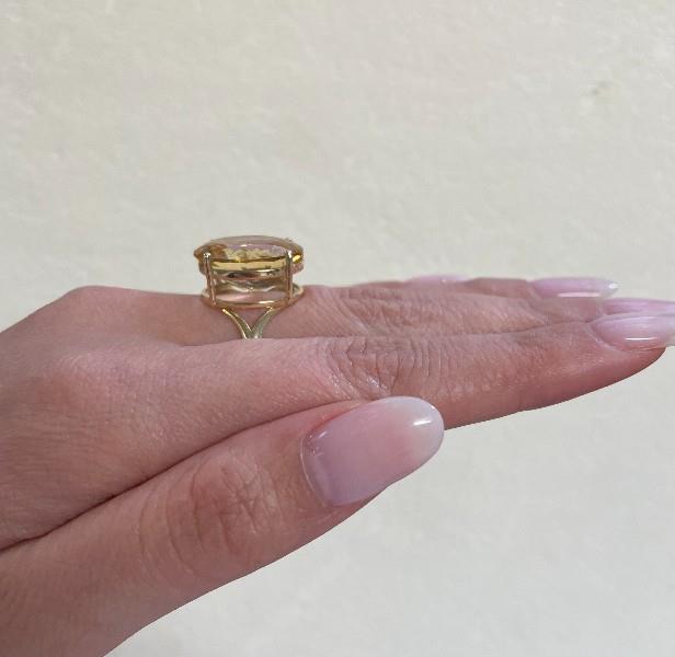 14ct yellow gold, presented as an oval cut Citrine, of approximate 15.80ct, displaying light to medium yellow tones, claw set onto deep double railings, merging into wide set spilt shoulders and into a half round, polished band. Ring size: R. Total weight: 6.2g
