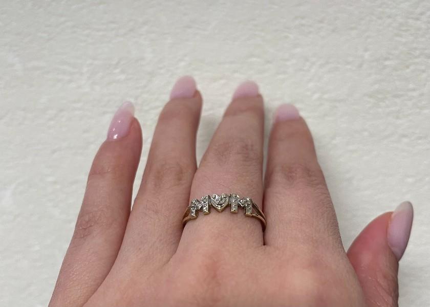 Both 9ct, the ring stamped, embellished with letters for MUM across with tiny diamonds, along with a 25cms length figaro link bracelet with clasp. N.B. clasp requires refitting to end piece. Additionally, one 18ct yellow gold sapphire diamond set hoop earring of 2.7grams and one 14ct yellow gold ruby and diamond set huggy styled earring of 2.3grams, both with pierced fittings.