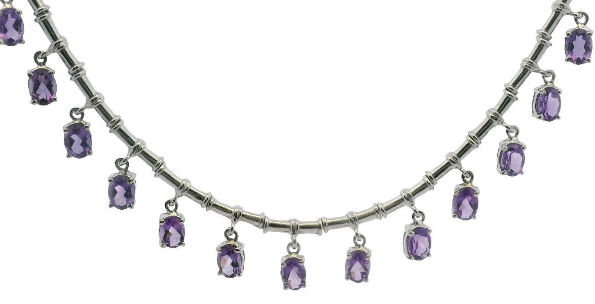 A STERLING SILVER TASSEL OVAL CUT 11.05CTS AMETHYST NECKLACE, 15.6GRAMS