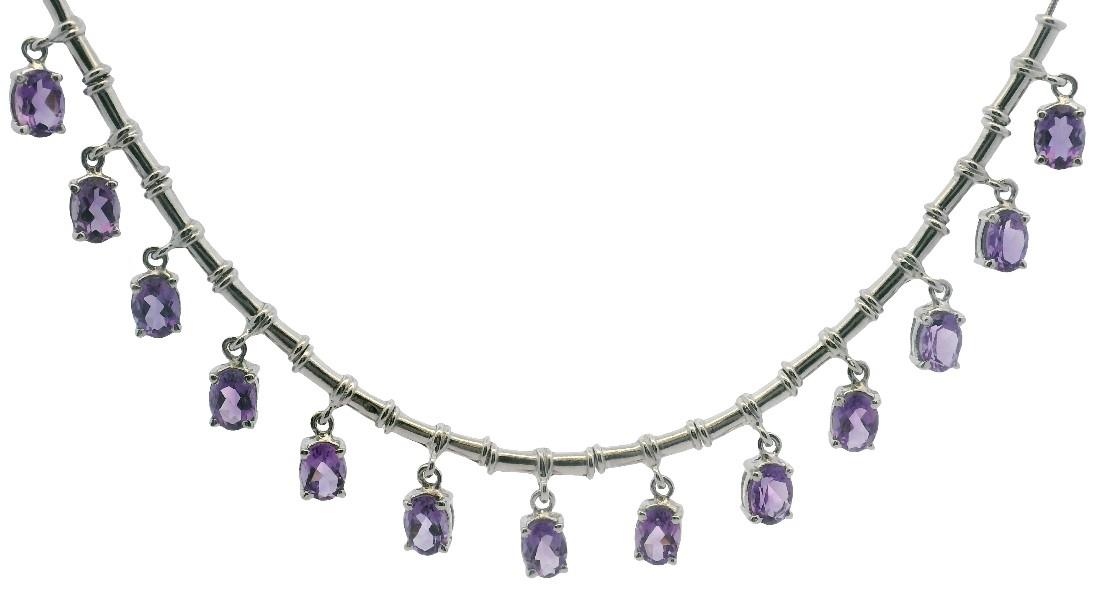 Sterling silver, featuring thirteen oval cut Amethyst, medium vibrant purple tones, totalling approximately 11.05ct, basket set, each articulated from individual studded bars, strung through on a snake link chain, measuring 40cm, complete with clasp. Total Weight: 15.6g