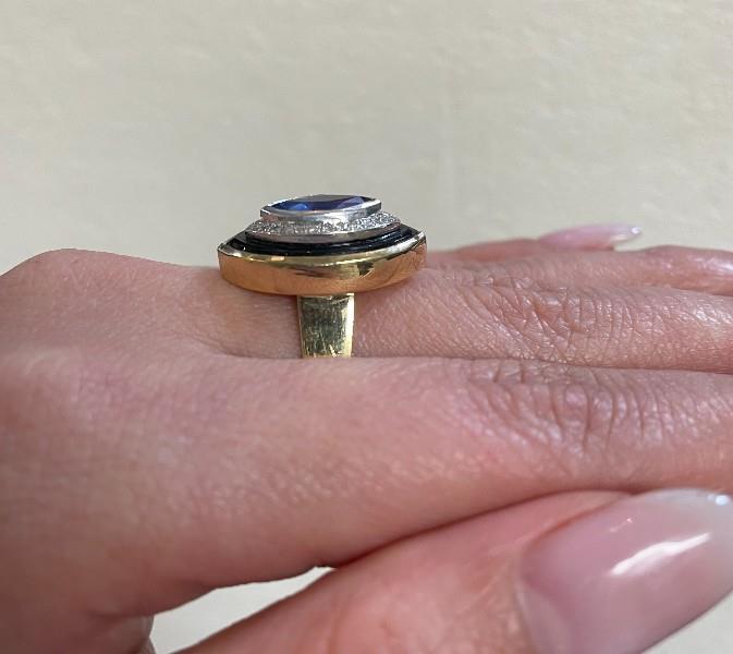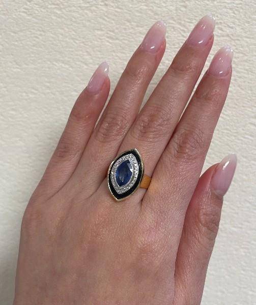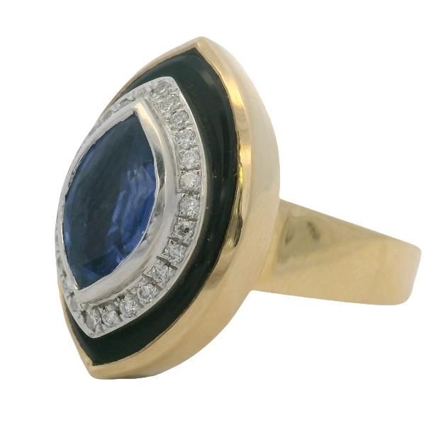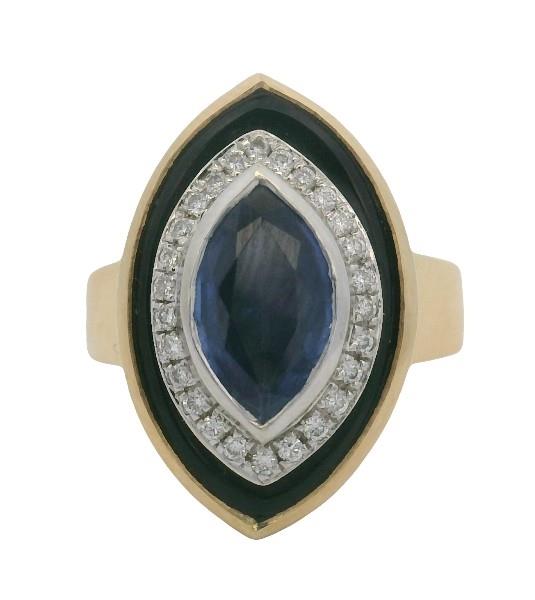 18ct yellow & white gold, featuring a centre marquise cut Sapphire of 1.50ct, medium to deep blue, bezel set, surrounded by a recessed round brilliant cut Diamond set halo, totalling twenty six with a combined weight of 0.18ct, claw set, bordered by an Onyx marquise shape plate, and enclosed into a yellow gold polished setting, slope wide shoulders, merging into a flat square edge band. Ring size: O. Valuation on request. Total Weight: 9.6g